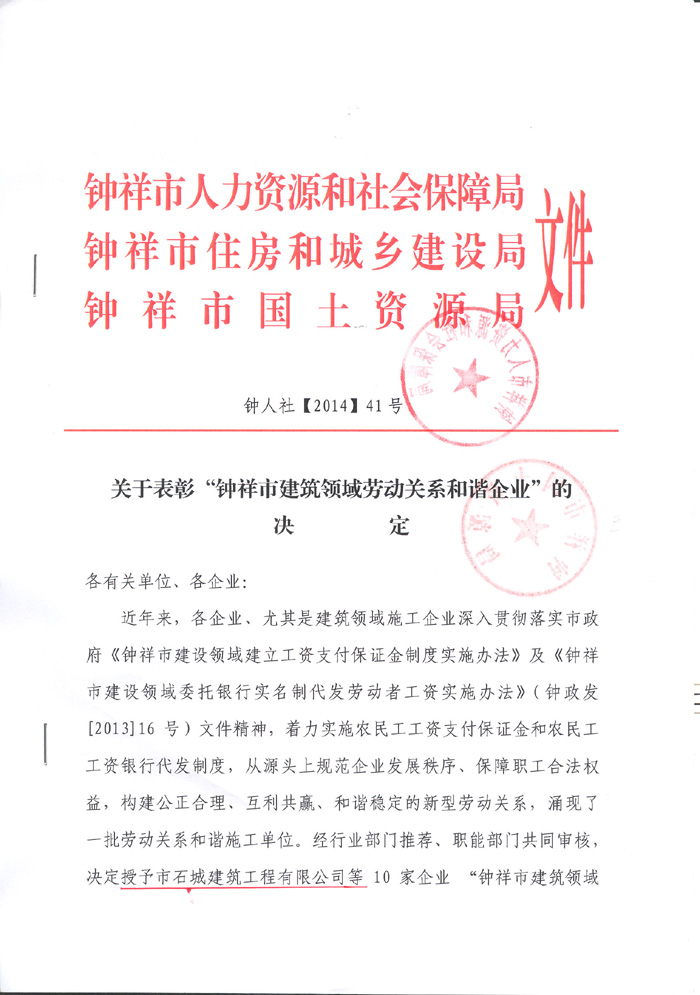 2014年4月榮獲“鐘祥市建筑領(lǐng)域勞動(dòng)關(guān)系和諧企業(yè)”稱(chēng)號(hào)