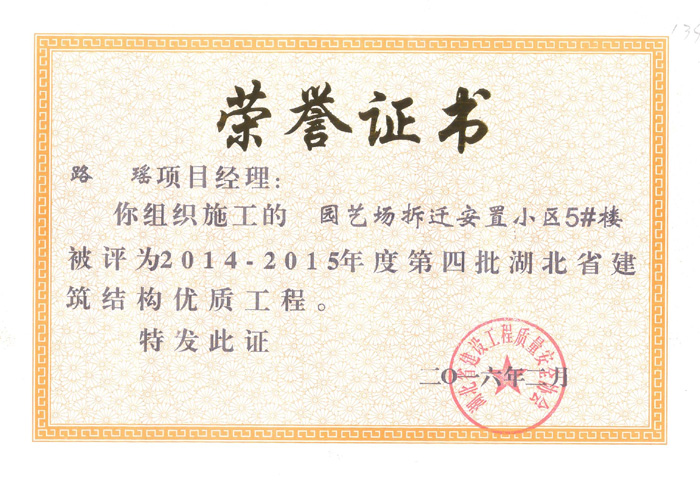2016你那2月路遙項(xiàng)目經(jīng)理被評(píng)為2014-2015年度第四批湖北省建筑結(jié)構(gòu)優(yōu)質(zhì)工程