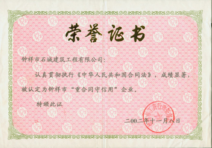 2002你那11月被認(rèn)定為鐘祥市“重合同守信用”企業(yè)