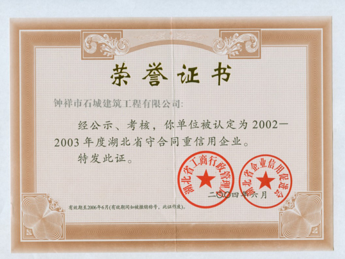 2004年6月被認(rèn)定為2002-2003年度湖北省守合同重信用企業(yè)