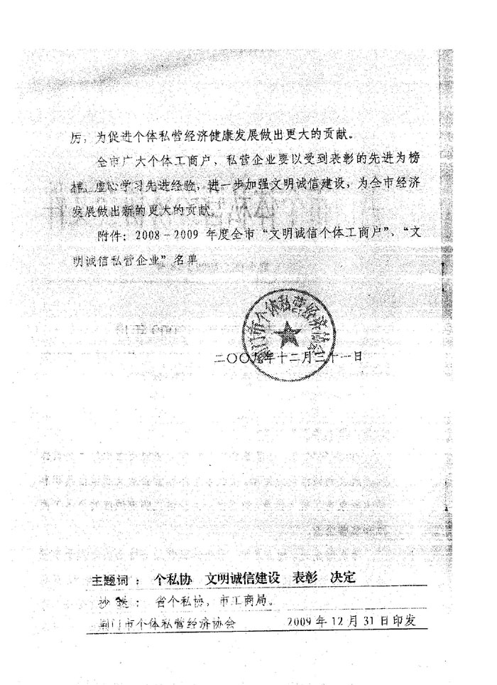 2009年12月榮獲2008-2009年度“文明誠(chéng)信個(gè)體工商戶(hù)”