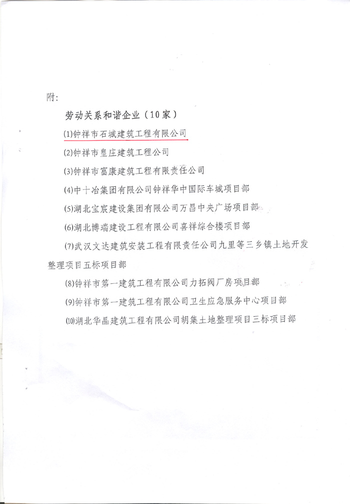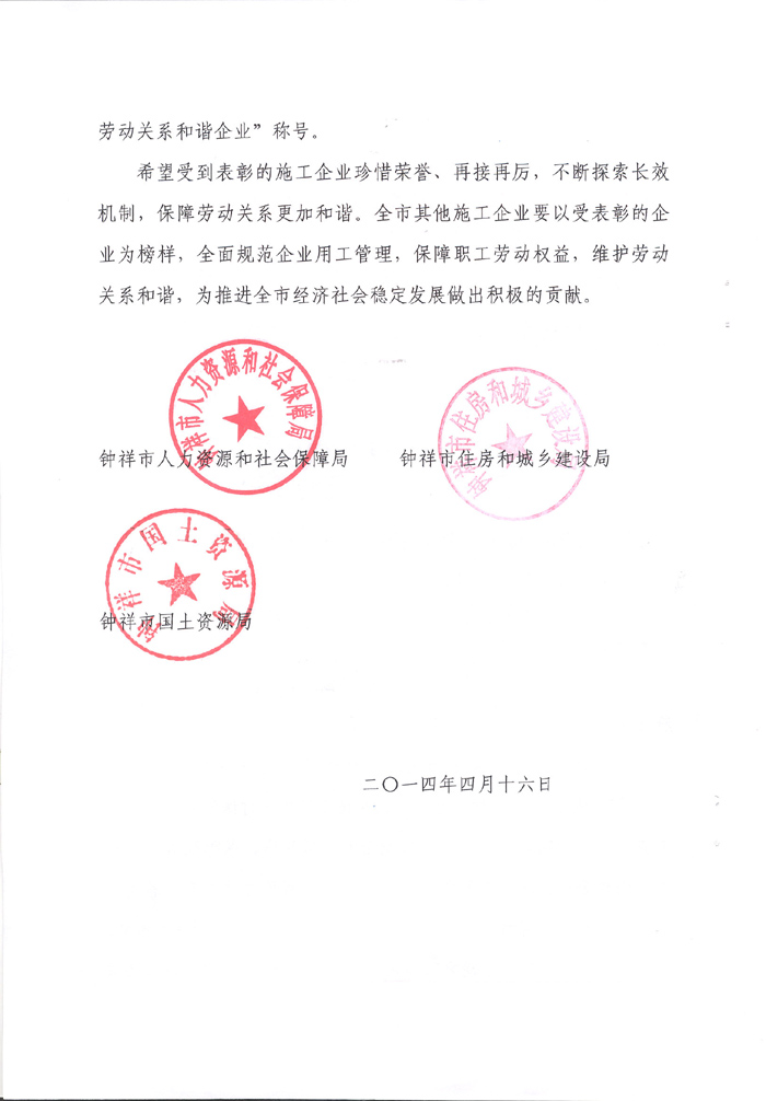 2014年4月榮獲“鐘祥市建筑領(lǐng)域勞動(dòng)關(guān)系和諧企業(yè)”稱號(hào)